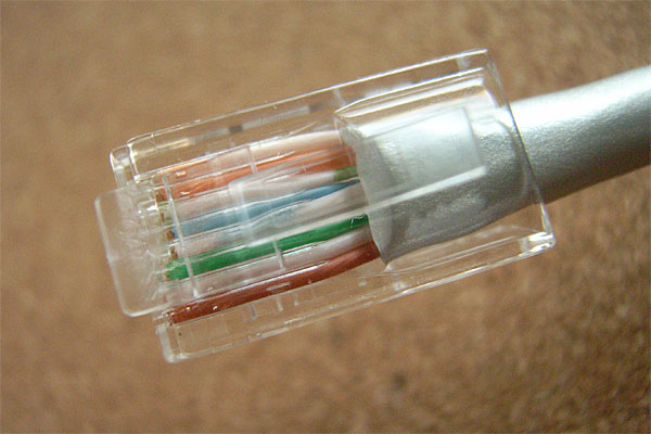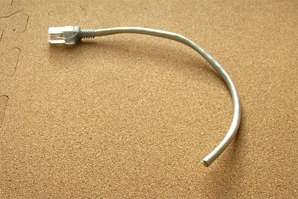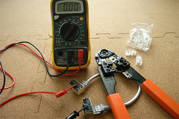 で、導通テスト。当然ながらケーブルテスタなんぞ買ってない。ジャンクショップで入手したモジュラジャックのパーツ。RJ45とRJ12が並んでいるばかりかLEDまで付いていて1個10円である。そいつとテスタでチマチマと導通チェック……1日に100本も作るんでなきゃ、これで十分なんじゃ!! ……オッケェイッ!!