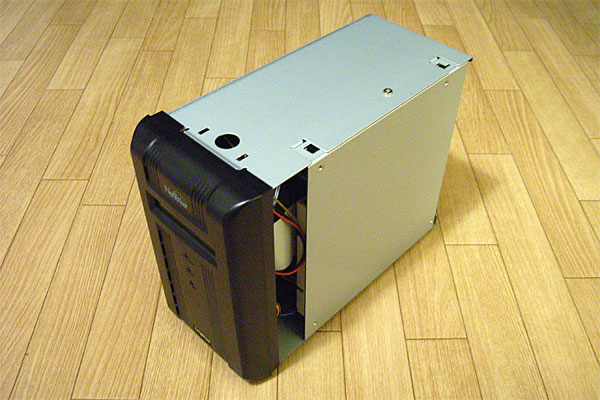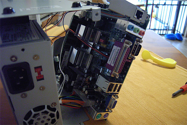 昨晩、半徹したので遅い朝ながらも、しばらく前にようやく歩き始めたウチのガキのイッペイの相手をしつつ、隙を見て本格的にサーバをバラしにかかる。なかなかしっかりした作り。本機は電源ファンがケースファンを兼ねる構造になっているが、非常に理にかなった空気の流れが作り出されるような配置になっている。感心。