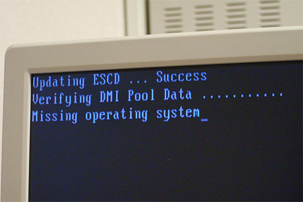 さて、名前に悩んだのはウソのように、適当にパッケージを選んでインストール完了。イザ、起動ッ!! ……しない。なんで? 「Missing operating system」ってディスク読んでるそぶりもないじゃんよ。またもや、BIOSのBOOT設定をどのように変えようが、ブートする気配がない。