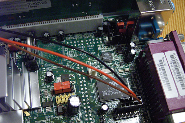 しかし、バラせばバラすほど、どこにも作りが特殊な部分は見つからない。フツーのATAのHDDが、マスター設定で、プライマリ側につながっている。マザー上にも特にヘンな接続はない。COM2が前面のLCDパネルにつながっているのと、PCI上のギガ蟹のLEDが前面パネルに引き出されているくらい……となると、BIOSの中身が特殊? それは、あまり考えたくはないが……。