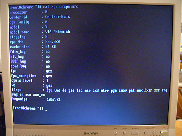 しかし、WikipediaでC3コアについて調べても、800MHzのNehemiahが存在するなんて記載はない。ググっても出てこない。そもそも、VIAのページを見ても、マザーとCPUの組み合わせについて言及した情報はない。でも、Epia-MLというマザーのクロックは800MHzで合っている。なんじゃこれ? もしかすると、これはよい意味でNAS特別仕様マザーなのだろうか? オイラは、200Mhz足りないというよりは、コアのリビジョンが高いという意味で好意的に取るぞ。なんにせよ、なんの心配もなくRHEL4のバイナリが使えるってコトだ。これはうれしい誤算だ。
