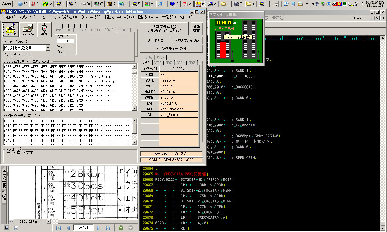 オイラは日頃、PICのプログラミングをZ80ニーモニックで行っているので、PICニーモニックのままでは意味がスッと頭に入ってこない。そこで、PICシミュレータ上のPICニーモニックを、Z80ニーモニックに変換しつつ、エディタに打ち込みながら動作を理解する。ふむ、ふむ、ふむんッ!! しかし、やってることはリバースエンジニアリングに他ならないが、Z80ニーモニックまで変換してしまうと、権利の所在はどうなるのだろう……とか、考えつつ、解析完了ッ!!