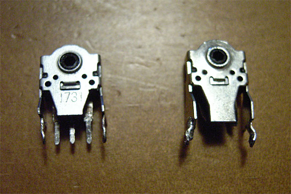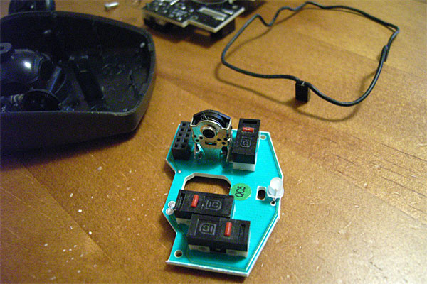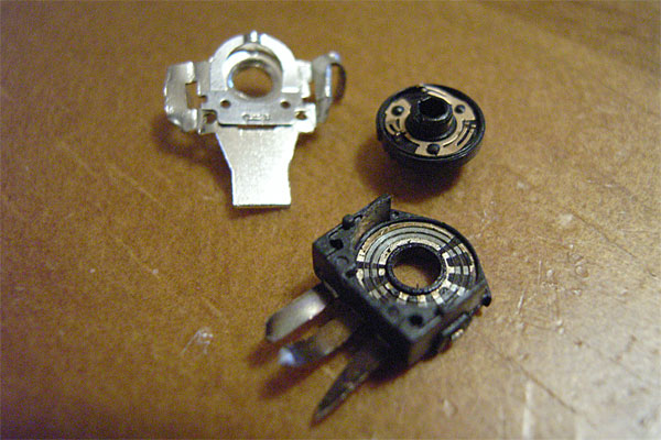 ドナーはコイツ。部屋に転がっていたアイテム。既に入手経路の記憶がない。いかにも安っぽいのでフタを開けてみたら案の定だった。ちなみにマウスのホイールの構造は主に2種類。ロジクールなどの比較的高額なマウスに用いられている光学式ロータリエンコーダ式と、まさにマウスのホイール専用に作られている金属接点ロータリーエンコーダ式だ。こちらは1パーツで回転検知を行いつつ、ホイールのコリコリという感触まで作り出せるので、安物マウスは大抵でコッチある。コリコリしたら安物と覚えよう。