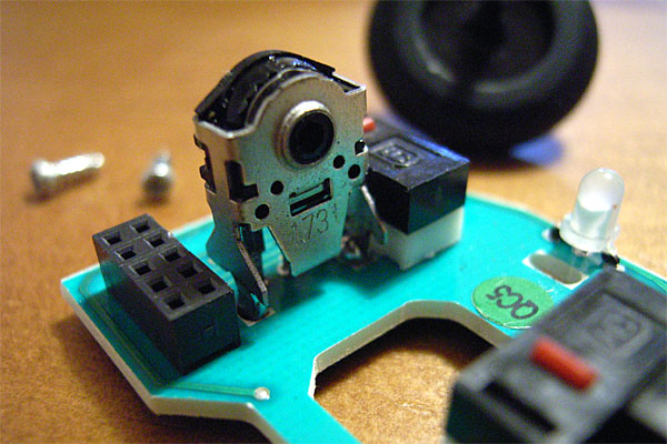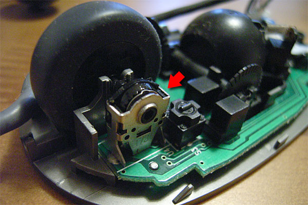 前回はホイールが「ガッ、ガシャッ、シャガシャガ……」などいう異音を発してクラッシュしたが、今回は特に音もなくおかしくなった。だが、症状は同様で、ホイールが1周するうち、1箇所でスクロールが止まったり、時にちょっと戻ったりする。では、早速であるが、術式を始める。