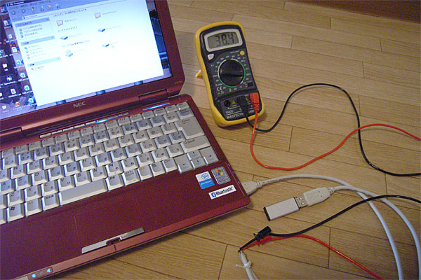 で、購入してから気が付いた。仕様を鵜呑みにするのでなく、消費電力を実測してみたらええんやないかと。ウチにはUSB延長ケーブルなんて売るほどある。そいつを1本ひっちゃぶけば、消費電流くらいテスターで簡単に調べられる。