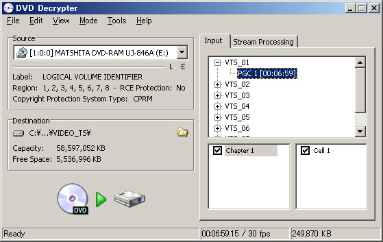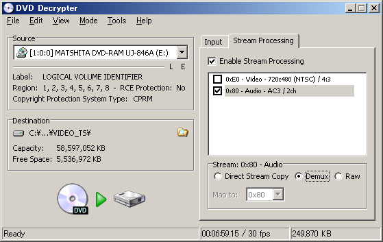 まず、HDDレコーダで予約録画、番組をDVD-RWに焼く。焼いたら、PCで音声を抜き出す。オイラは、DVD Decrypterを使った。Modeを「IFO I」にして、トラックを選択、「Audio - AC3」を処理対象とし「Demux」として切り出し開始。よくわからんが、AC3形式のファイルが出力される。