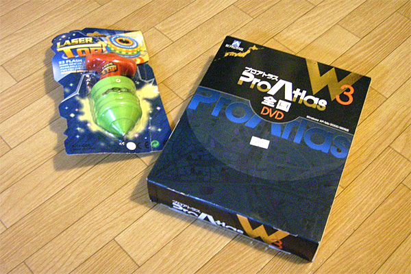 さて、ついでに秋葉に寄って帰る。やはり買うものはなかったが、イッペイへのお土産に、あきばおーで、「光るコマ」を200円で、パッケージソフトのジャンク箱から「プロアトラスW3全国版」を3000円で救出して帰宅。光るコマは回してみてビックリ。なんとレーザーで床に輝線を描き出すというシロモノ。部品としてもレーザーモジュールは200円では買えないぞ。イッペイはかなり気に入ってしまっているので、当分はバラせないが……もう一個、買おうかしらん。