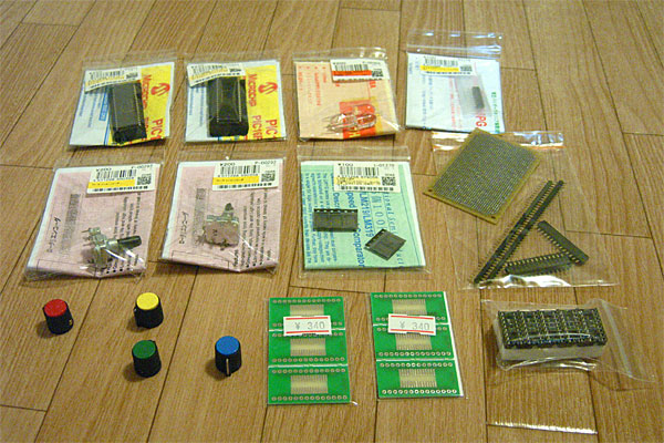 最近、連投しているが、またもや秋月。なんとなく、PIC16F887(250円)x2、直径10mmとやたらデカいオレンジ色のLED(3つで200円)x1、オーディオアンプTA7368P(100円)x1、ロータリーエンコーダ(200円)x2、高速コンパレータLM319M(5個で100円)x1、ハーフピッチの蛇の目基板と低いピンヘッダ、つまみ各色(40円)x4、8ピンのICソケットx10。千石でハーフピッチ変換基板ICB-010(3連で340円)x2。