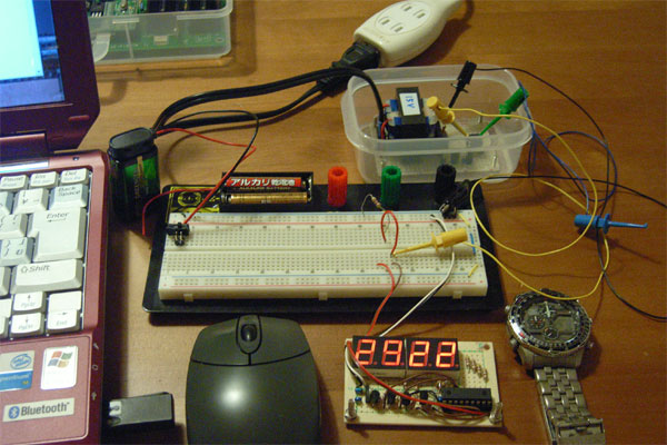 長らくチマチマと作業を進めてきた、家庭用電源の50Hzで時計を作るプロジェクトであるが、とりあえず50Hzをカウントして時刻を表示する、というところまできた。ずっと疑問に思っていた電源の50Hzの精度であるが、脇に腕時計を置き、秒単位のズレを目視で確認した限りでは、1時間で0.5秒程度のズレが生じるようだ。