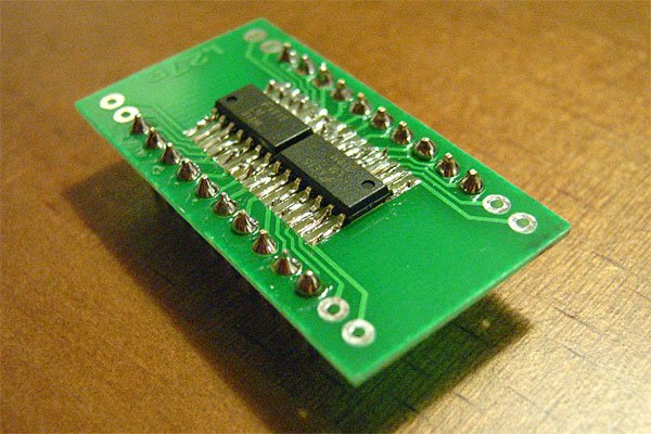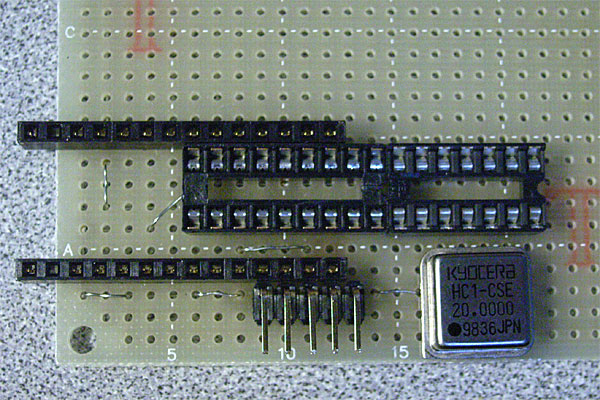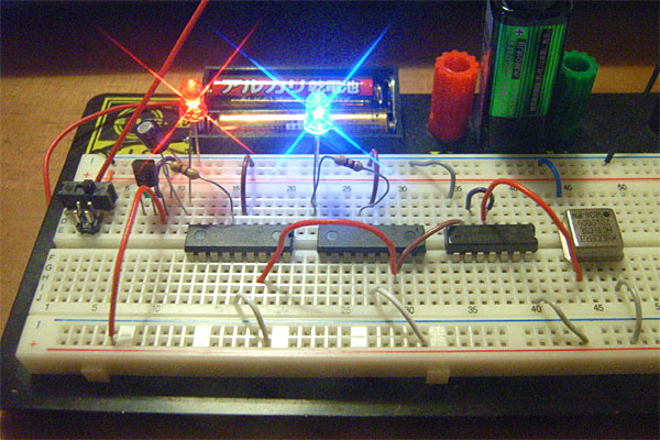 水晶の出力ではココロモトないのと、別途ANDゲートが必要になる計画もあるので、今度は2003年の後半に購入したと思われる秋月ジャンク袋から取り分けてあったLS7408を取り出す。ANDゲートだが、実際はオシレータの出力を両方の入力に接続して、単にバッファとして使うのだ。そういえば、先日の7segも同じジャンク袋に入っていたヤツだっけ……と思いながら、ブレッドボード上でテスト。キチンと20MHzで(たぶん)同期動作に成功した。