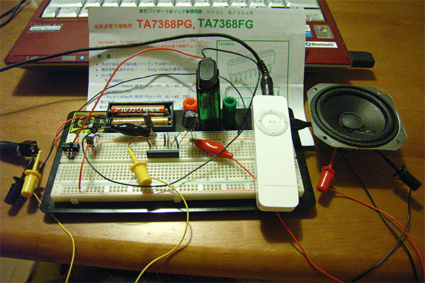 調子がいいので、もうひとつテスト。先日、秋月で購入したTA7368という100円のアンプICを試す……と、あっけなくスピーカが駆動した。テスト用の音源はiPodShuffle内の、最近かなり気に入っている後藤真希のGIVE ME LOVE。スゲぇイイ声なんだよなぁ。どうでもいいけど。