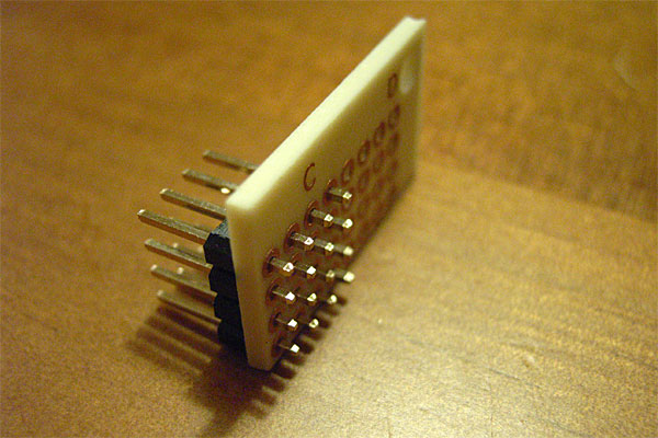 昨日、取り出したトランスを電源に仕立て上げるため、まずは基板に載せる。天高くソビえるコンセントの差し込みがチャームポイントだ。ついでに、先日用意したゲッターパーツ(ゲタ)をケーブルにハンダ付けして、PICのインサーキットプログラミング用のケーブルとして仕上げる。ピンアサインはこんな感じにした。秋月のライタに8pinのPICとして挿して使う。