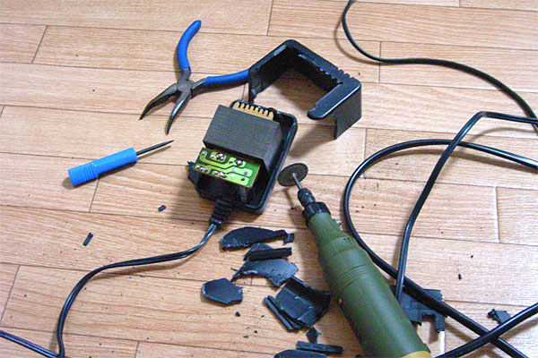 次の獲物は9V300mA。ちょっと容量が心細いが……ん、んん? コイツは珍しくネジ止めだ。しかし結局は、片方しか外れず力ずくで破壊。しかし、コイツはコンセントの差し込みが天高くソビえてしまう仕様。相手がモノだけに、外したり切ったりは無理そう。まぁ、いいや。笑えるし。