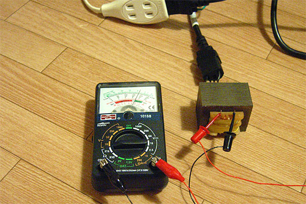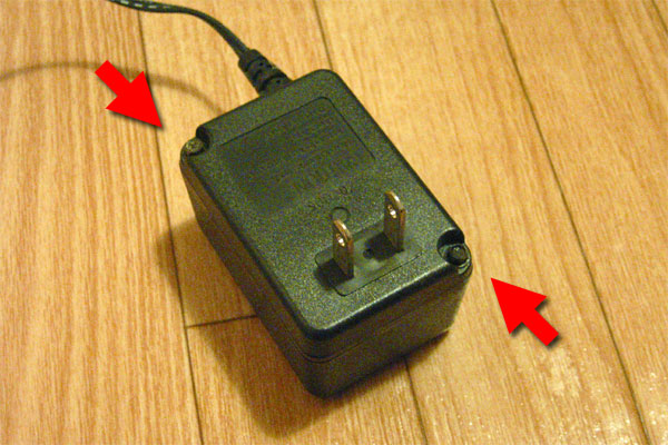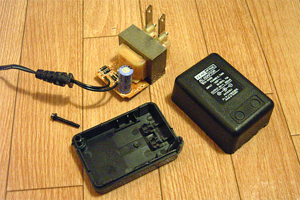 先日ぶっ壊したACアダプタは、目覚ましラジオに持って行かれたので、オシロ用の電源としてもうひとつ確保すべく、破壊活動にいそしむ。