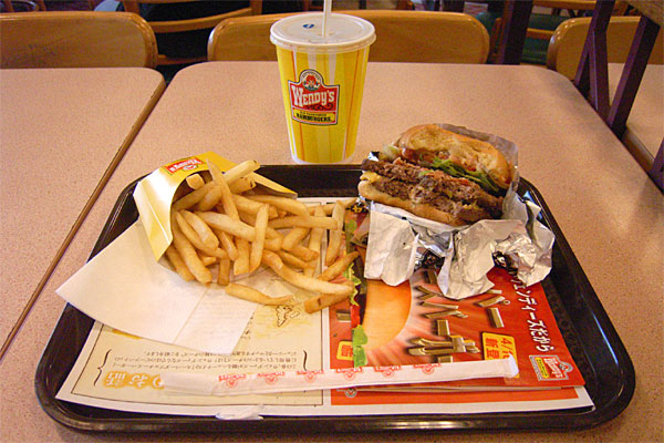 昼は隣のダイエーの中のウェンディーズ。ぱっと目に入ったので決めたのだが、うまいなぁ、ココの肉は。こんなことなら、スーパーメガウェンディーズを食っておけばよかったなぁ……と、パパッと食い終わったところに、カミさんからメール着信。なに? イッぺイを連れて応援に来ている? 今回はカゼ気味だから、来ないと言っていたのに、もうメシ食っちまったぞ。仕方なく、ケンタッキーでコーヒーだけ付き合う……つもりが、時間が余ったので、上のゲームコーナーでプリクラまで撮ってしまう。たぶん、昼休みにガキとプリクラ撮ってたヤツは、日本中の受験者でもオイラだけだろうな……。