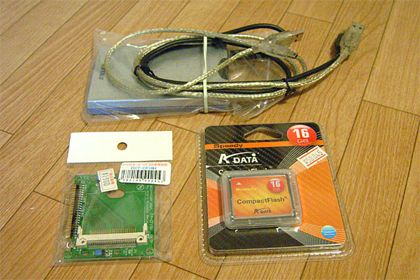 一方で、そんな若松にはCFアダプタも売っている。コンパクトフラッシュを挿すと、1.8インチのHDDスロットにHDDとして挿せるというシロモノだ。しかし、最近は安くなったとはいえ、許せる容量のCFが、許せる値段で売っているもんかいな……と、調べたところ16GBで8千円弱からある。奇しくも、2千円弱のCFアダプタと併せると、ちょうど1万円である。