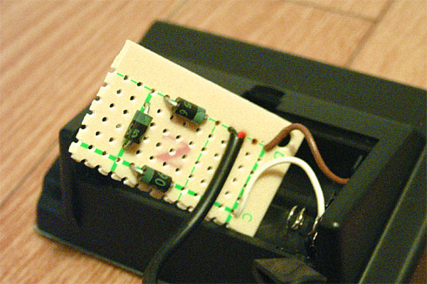 DigiPodは単4電池2本だから、要求電圧は3V。どうしようか。3端子レギューレータを使うまでもないだろう。ジャンクのダイオードを選別して、ブレッドボードで動作チェック。並列3本だとちょっと高め、並列4本だとちょっと低め……ここは高めを狙っておくかな。