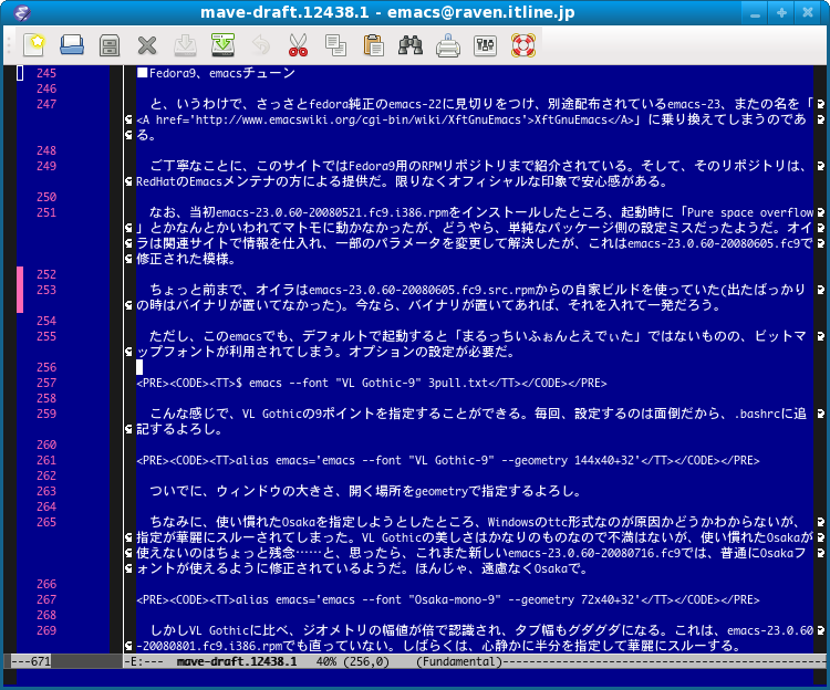 ちなみに、使い慣れたOsakaを指定しようとしたところ、Windowsのttc形式なのが原因かどうかわからないが、指定が華麗にスルーされてしまった。VL Gothicの美しさはかなりのものなので不満はないが、使い慣れたOsakaが使えないのはちょっと残念……と、思ったら、これまた新しいemacs-23.0.60-20080716.fc9では、普通にOsakaフォントが使えるように修正されているようだ。ほんじゃ、遠慮なくOsakaで。