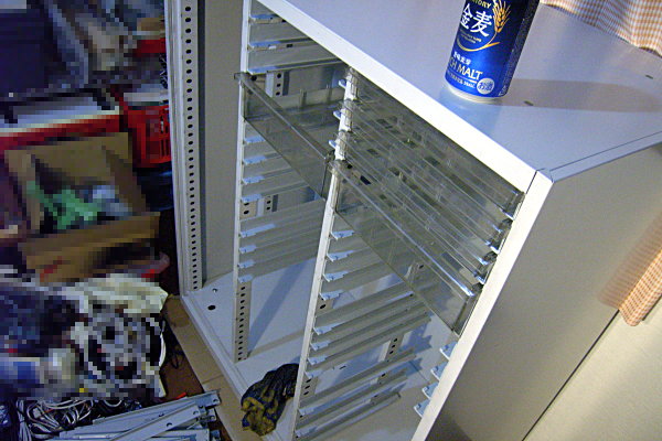 こりゃ、民生用でなく、業務用でなくてはならない。うっすらと、そう感じつつも、そんなものが存在するのか、入手できるのか……数日間、ぼんやりと考えていたが、考えててみれば、考えるまでもない。フツーに事務所でパンフレットとかを入れている、アレでいいのである。調べると、クリアキャビネット、とかいうらしい。