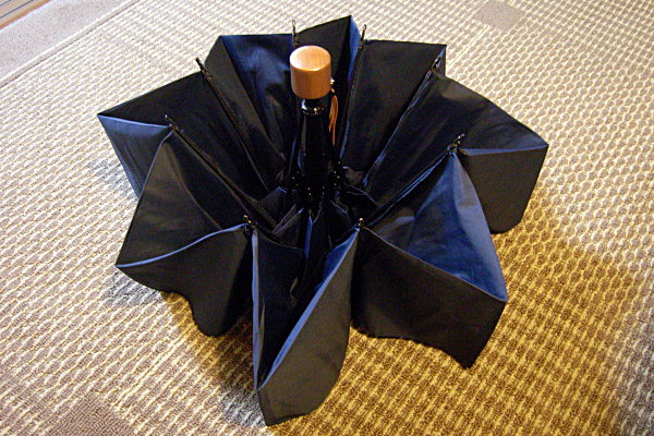 通常、折りたたみ傘は、折りたたむと、濡れた面を露出する形でクルクルと巻かれて格納状態になる。しかし、この折りたたみ傘は、濡れた面を内包する形で巻かれるのである。つまり、たたんでから、例え、雑にであっても巻いてしまえば、即座にカバンに放り込めるのである。ビショビショだからと、手にぶら下げておく必要がない。これは電車通勤に便利だ。