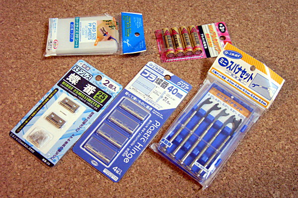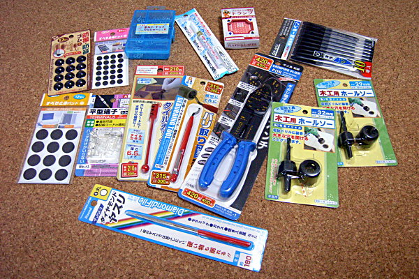 今回、木箱にデカい穴を空ける必要があるため、ホールソーを買いに行く。100円のダイソーである。別に穴を空ける手段はホールソーに限らないが、さすがに「100円で買えるんなら買うっきゃない」のである。ついでに、使えそうな工具やら、パーツやらを大量に買い込む。品質に期待はできなくても、ないよりマシという工具は、いくらでも存在するのである。