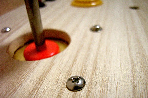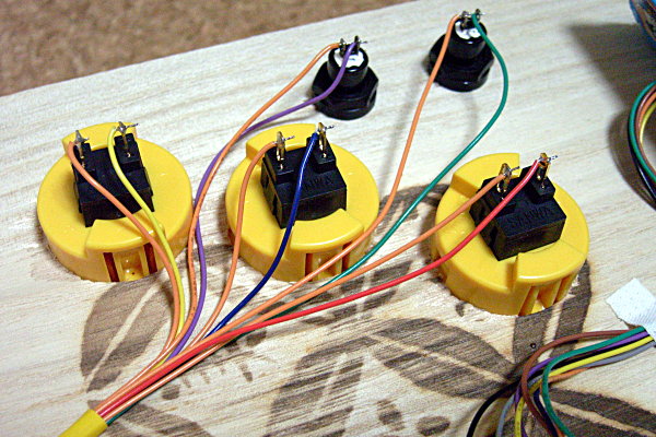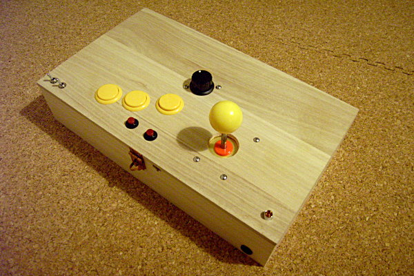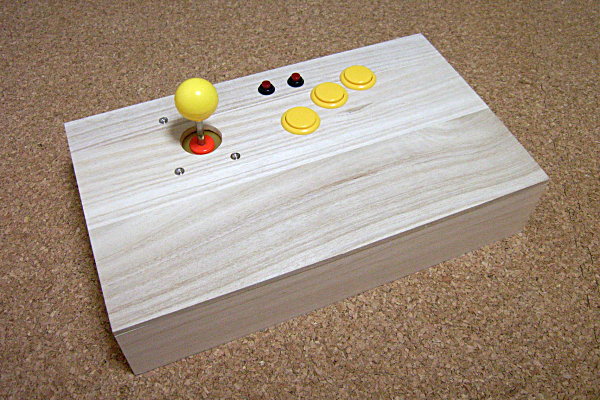 ボタン部分のアップ。自然に自分の手を置いて、指の位置を中心にボタンを並べた。まさにオーダメイド。そういえば、どこかのサイトで、ジョイスティックの自作用に、既存のジョイスティックのパネルの図面を配布していたが「それは逆」じゃないかと思う。自作するからには「自分の手に合わせる」絶好のチャンスではないか。