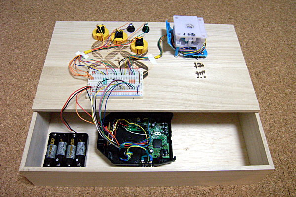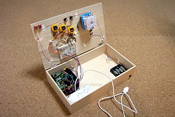 それから、電源ジャックと電池ボックスも取り付ける。昔のラジカセよろしく、ジャックインすれば、電池ボックスからの電源供給は停止し、電源が切り替わる。組み込みのゲーム機や、将来的に連射装置等に供給する電力に利用する予定だ。動作はあくまでブレッドボード上の回路に依存するが、今のところ、右奥に装備したトグルスイッチで、電源のオン/オフできるように組んである。