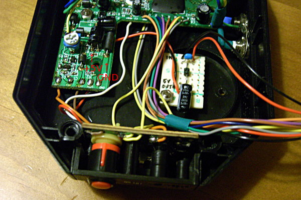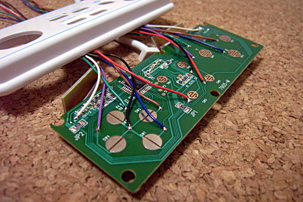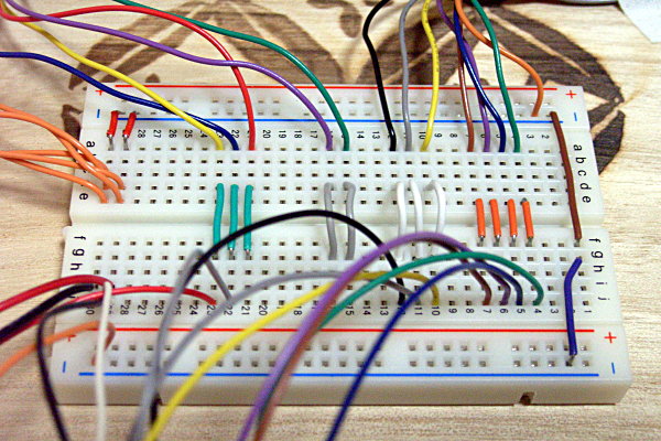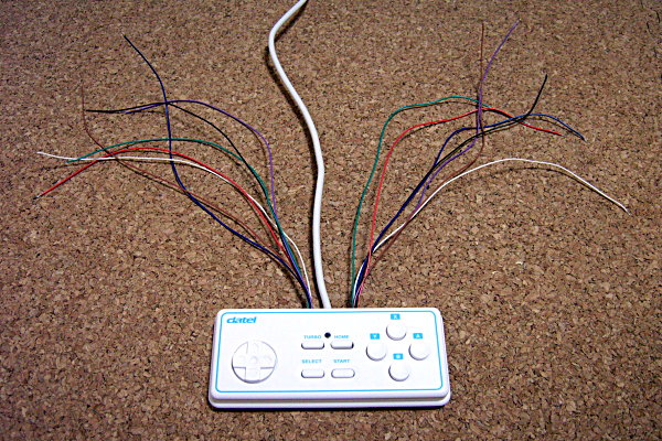 ブレッドボード部分のアップ。これが今回のミソ「ヴァリアブル」のネーミングのモトである。昨日のエントリに書いたように、ジョイスティックは、PC のキーボードと同じく、手に馴染んだものを、末長く使うべきである。そこで、ゲーム機の機種が変わっても、速やかに対応可能なよう、回路の大部分をブレッドボード上に構成してしまう仕様とするのである。