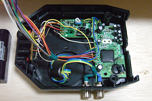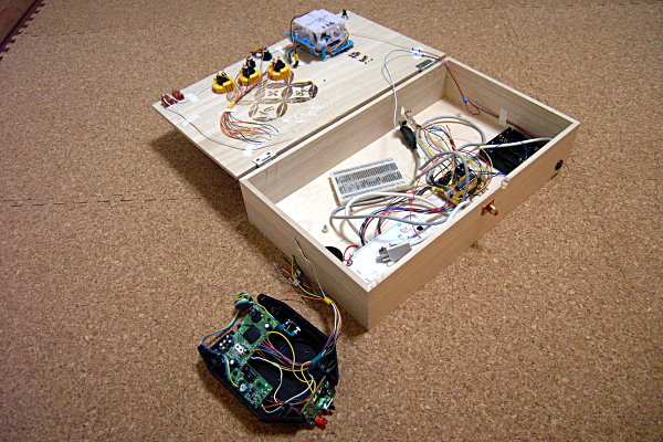 そこで、すかさずゲーム機の面倒を看に戻る。まずは、本体の箱の中からゲーム機の内臓部分を取り出す。ついでに、内側に取り付けたパドルコントローラの部品と、ブレッドボードが微妙に干渉するモンで、ブレッドボードも外し……てしまうと、ソコソコ整然とパーツや配線が設置してあった「JS-1V」の中身は、もうグッチャグチャである。ビジュアル的にかなりショックな状態。そもそも「JS-1V」自体、ジャンクパーツの集合物なのだが、ホントにゴミみたいな見た目になってしまった。ここ何日か、入れ込んでいるだけに、かなりの精神的ダメージ。ううぅ。