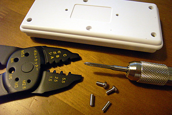 コントローラの本体は、ジョイスティック本体の箱の中に収めるので、内部に固定するためのプラ版をくっつける。両面テープでもいいけど、せっかくなのでネジ止めにしよう。本体の裏側にタッピングツールで3mmのネジ山を掘る。厚みがわずかなので短いネジが必要になるが、ここで先日購入した電工ペンチがリングに上がるのである。ボルトカッターって、こーゆーモンなのか。ネジ込んでバチンなのね。思ったより力も必要なかったし、加工もキレイだ。今後は、切断を前提に、長めのネジを買っておくことにしよう。ダイソーで400円の工具だが、これはお勧めかも。