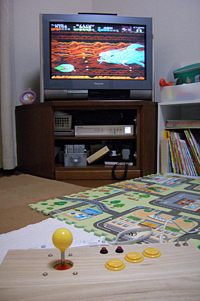 完成したら、早速、ダライング。んが、最初、ボムが出ないことに首をヒネってしまった。いろいろ試したところ、不思議なことにジョイスティックのフタを閉めるとボムが出なくなる。少しでも浮かすとボムボタンが効く。ホンの少し……であっても浮かせば効くぅ!? ……ん?あーッ、ジョイスティックの内側の部品が、ちょうど中のコントローラのAボタンに当たって押しっぱなしになってんじゃん……アホな理由。