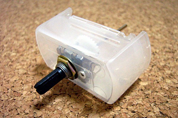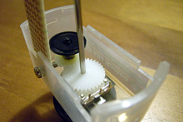 しかし、ケースに収めて軸を回転させてみる……と、軸が微妙にフラついてしまう。うーむ、工作精度が足りないということか……そりゃ、目分量でピンバイス使ってるんだもんなぁ。しかし、根本の方ならフラつき量は許容範囲だろう。とりあえず、作り直さずコレで行こう。