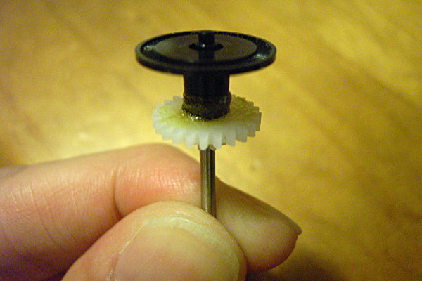 まずは、歯車を入手する。以前に、イッペイに買ったオモチャを引っ張り出してきて、マブチで後輪を駆動している部分の歯車をサルベージする。オモチャとしては、歯車を3つ使った減速機が組まれていたが、3つまでは不要であろうと判断し、2つを逆に使った加速機を組むことを目論む。