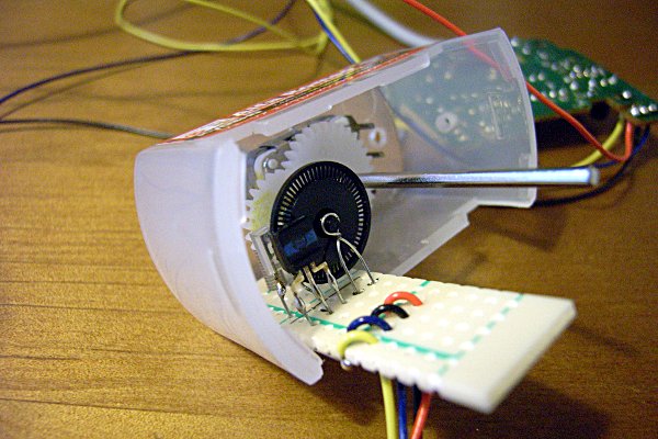 無駄に長くしてあった、パドルコントローラとマウス基板との間のケーブルを切り詰め、両端をハンダメッキ。完成したパドルコントローラ本体、ブレッドボード、および、マウス基板を本体内に固定し、ブレッドボード経由で双方を接続、マウス基板から延びるUSBケーブルをPCに接続する。