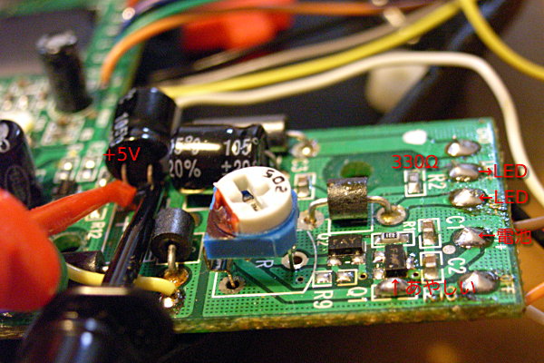つーか、そもそもこのゲーム機の動作電圧はいくつなんだ? 使う電池が単三4本なんだから、自然に考えれば5Vだ。LEDに直列に配置してある抵抗が330Ωというのも、供給電圧がその前後であることを裏付けている。