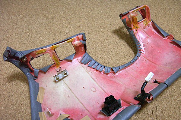 さて、複雑骨折したSVXの内装だが、こりゃ簡単に治りそうも内装……なんてダジャレている場合でもない。一応、ビールのアルミ缶を切ってはみたが、既に補強する相手の強度がまるで期待できないので、ネジとかで止めるのは無理そうだ。あっさり、廃案。