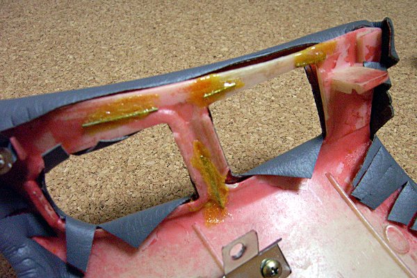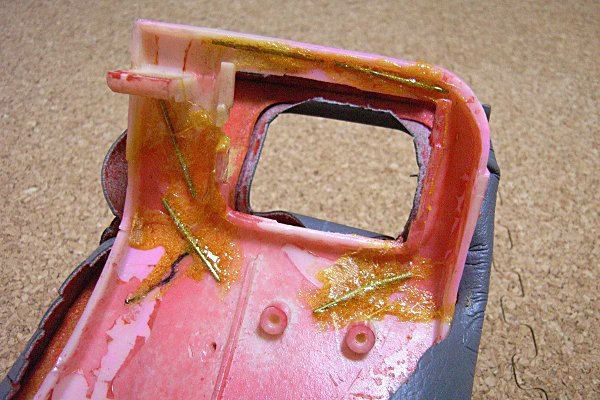 順当にハナクソボンドで止めることにした。ちなみに、オイラがハナクソボンドを多用するのは愛用しているわけではなく、たまたま手持ちであるからだ。ホントはエポキシ系とかいうヤツのが頑丈らしいので、そういうのを使った方がいいかもしれない。ただ、いずれにせよ、当初のプラスチックの性質と同様、単なる堅さよりは、ちょっと粘っこい系の強度が必要なので、ボンドの中に針金を泳がせておく。針金は、はるか以前に購入した、ゴッツいジャンクダイオードの足を切ったもの。