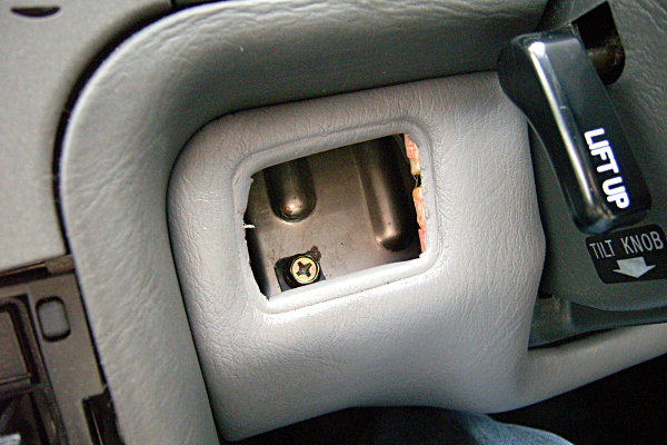その内装とは、運転者の膝の上、ハンドルの下、両脇にコインケースやミラーの操作パネルが埋め込んである板状の部分のこと。向かって左側内部で金具に引っかけてある「ツメ」が折れてからというもの、左側がブラブラ状態になってしまい、常に2cmくらいの隙間が開いてしまっているのだ。みっともないことこの上ない。