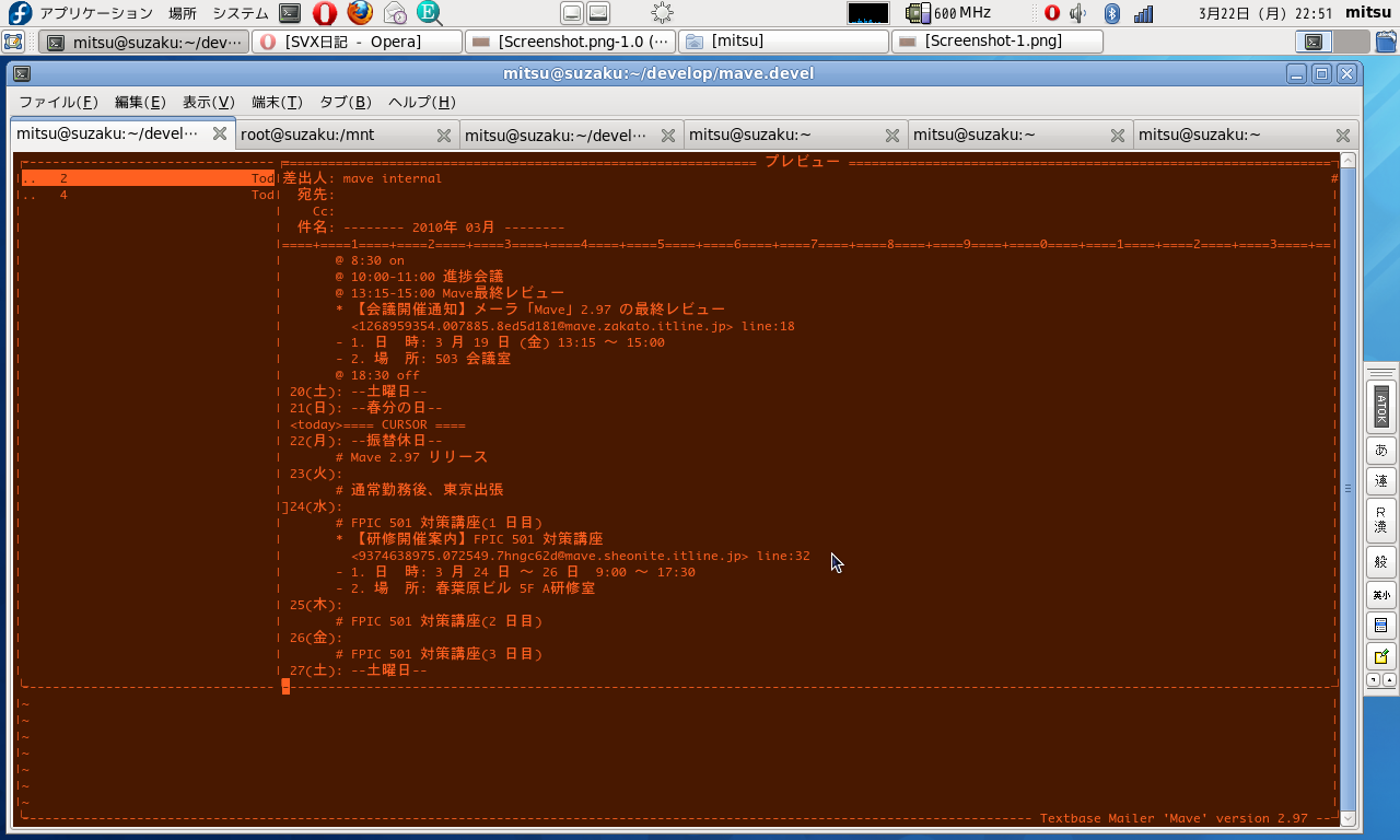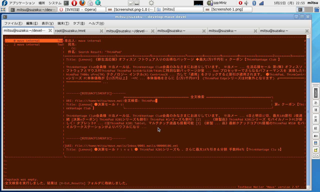 先ほど、テキストベースのメーラ「Mave」のバージョン2.97をリリースした。メールの一部をメッセージIDと併せて引用するためのクリップ機能。メールのメッセージID/ファイル名をキーとするタグジャンプ機能、シェルコマンドの結果をメールとして取り込む機能、それらを組み合わせることで実現できる全文検索機能、おまけに、添付忘れ警告機能なんかも実装してみた。