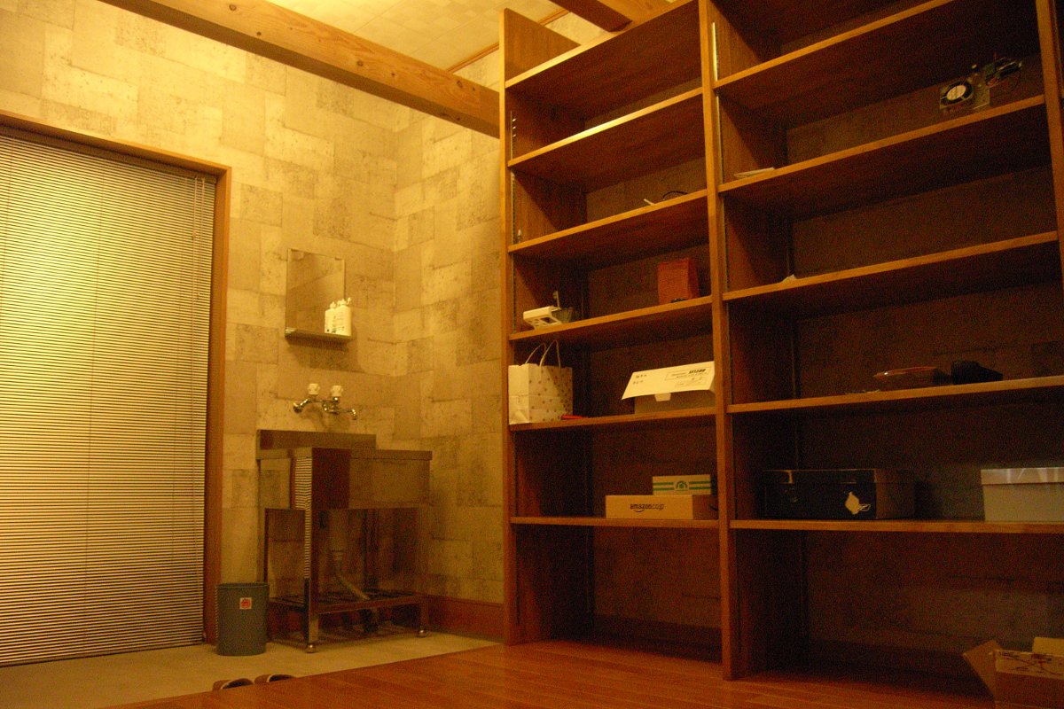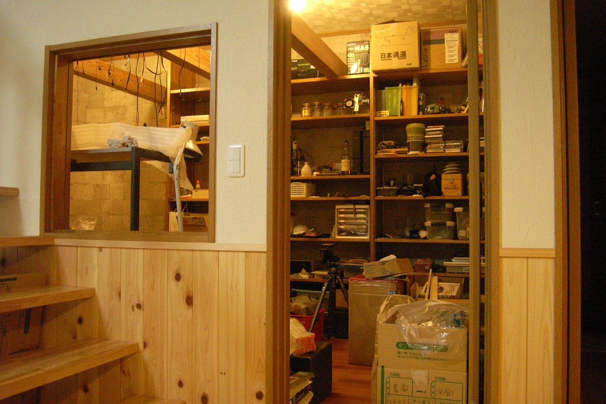 ちなみにこれは、リビング側から工房を見たところ。工房は、リビングに隣接しており、このような「窓口」を設けてある。通常は開けておくが、来客などの際には閉める運用も可とする。万が一、工房のカオス度が上昇した場合でも、お見苦しくないように配慮した装備である。