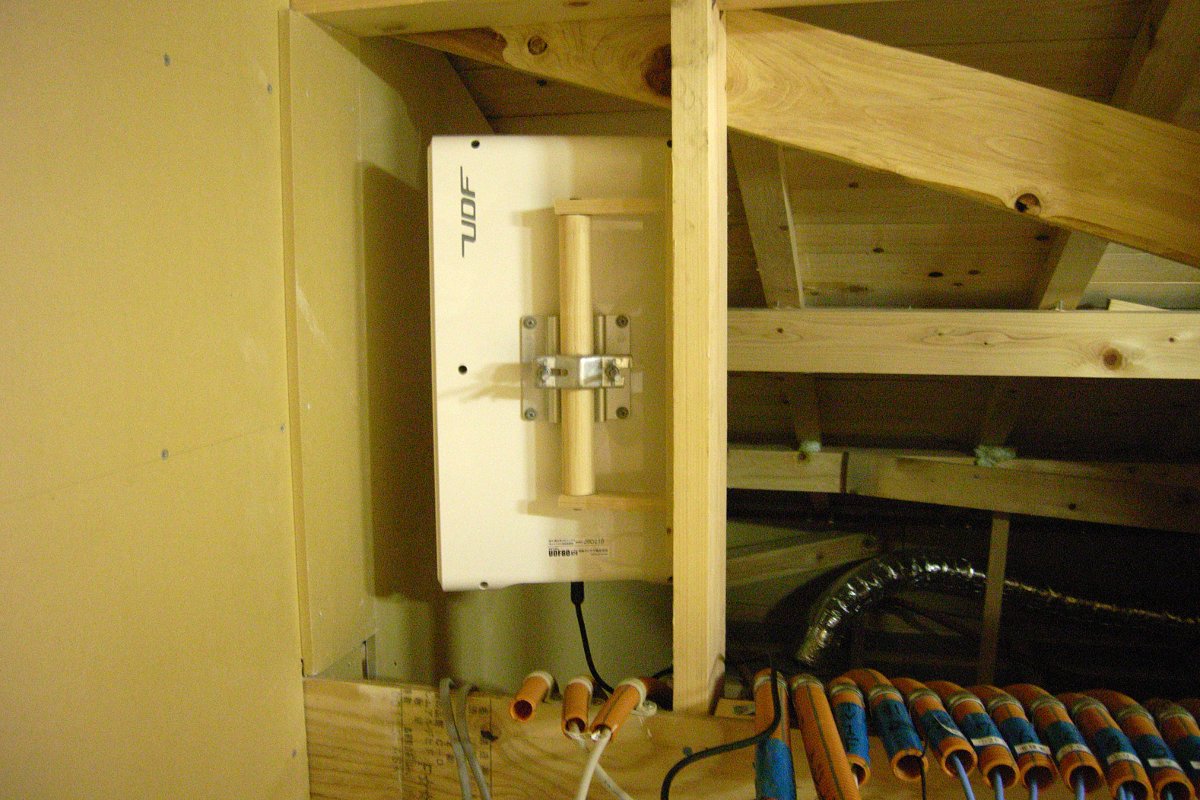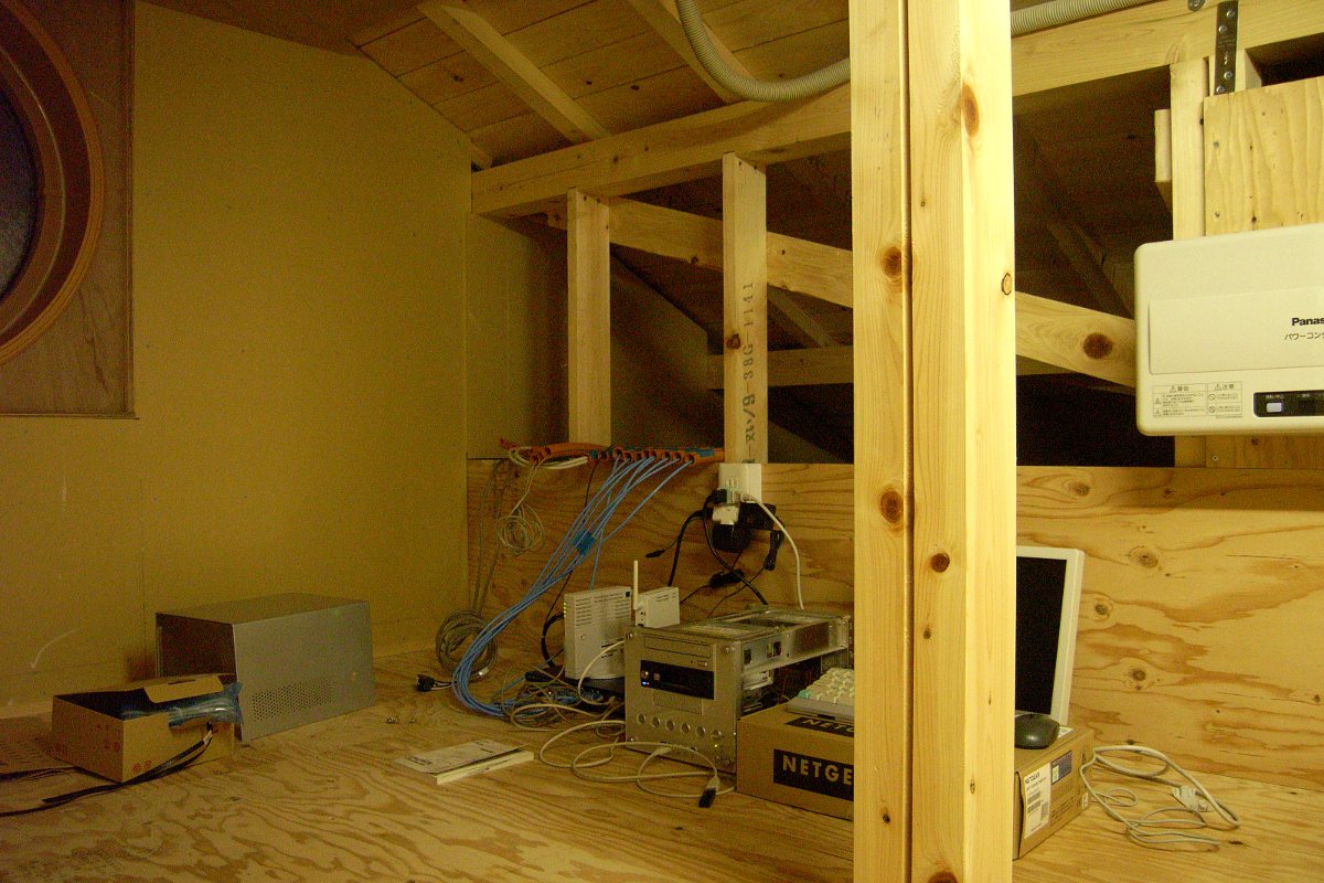そして抜かりなく、ファイバカムホーム。午前中にはゴンドラがやってきて、めでたく開通である。ファイバは小屋裏へ。小屋裏には、24ポートのスイッチがあり、各部屋へカテゴリ5EのLANケーブルが配備済みである。うっしっし。