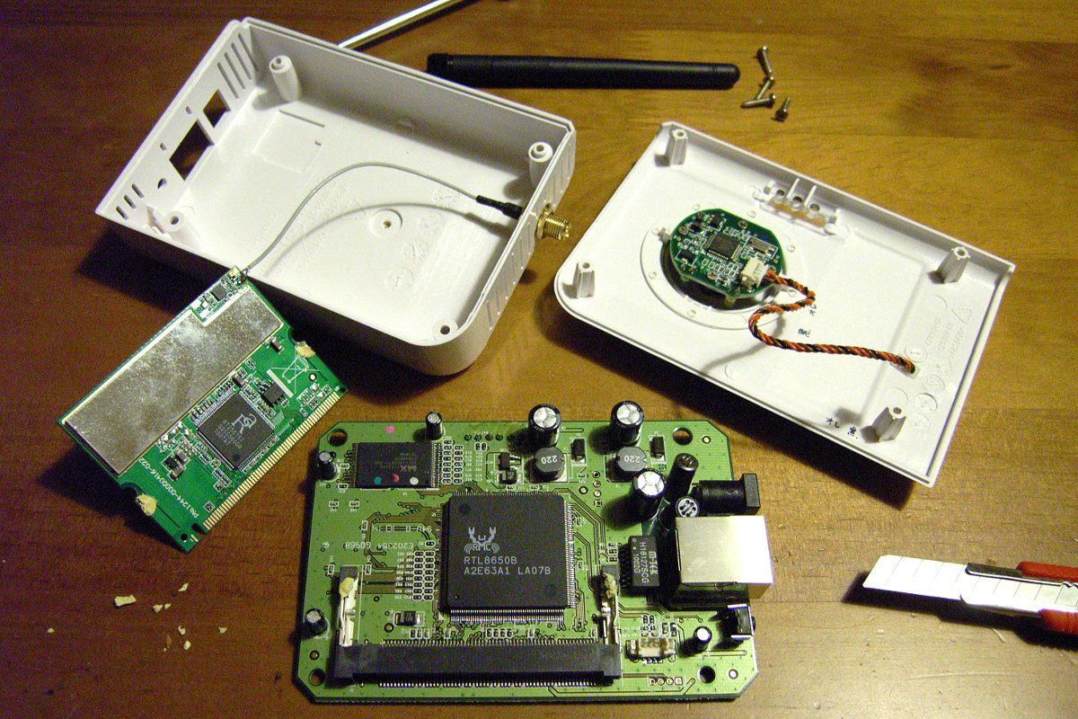 無線LANモジュールの下のデカい「RTL8650B」というチップは、単体でCPU, LAN, USB, Serialの機能を有しているらしい。デカいだけあるな。ある意味、究極のワンチップマイコンだ。