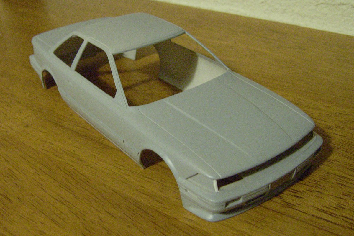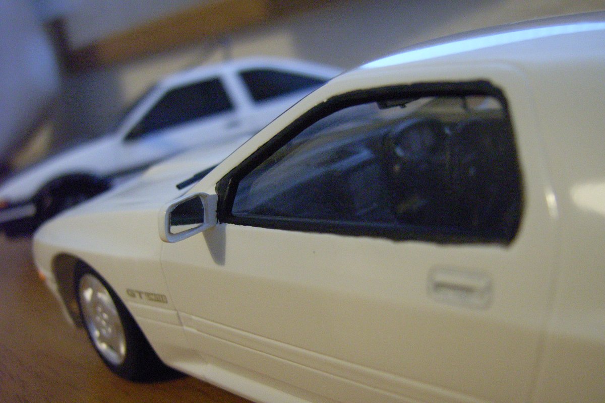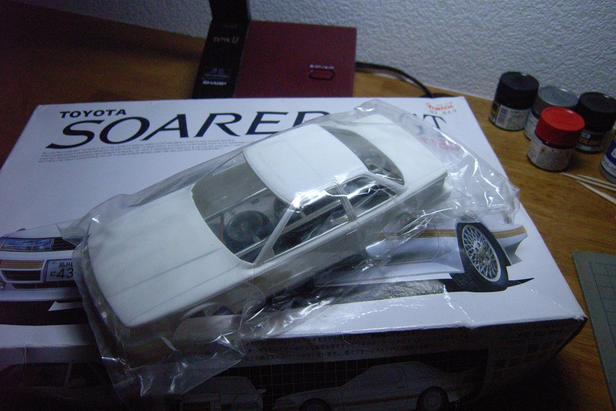 で、乾いたらクリアを吹く。透明の塗装でコーティングするワケだ。2回くらい吹いて、1時間ほどしたら、コンパウンドで磨きまくる。あ、今回は、オマケにデカールを貼ってみた。現在、制作中のソアラで余るはずのデカール。深い意味はない。クリアを被せるならそういうことも可能ってことで。