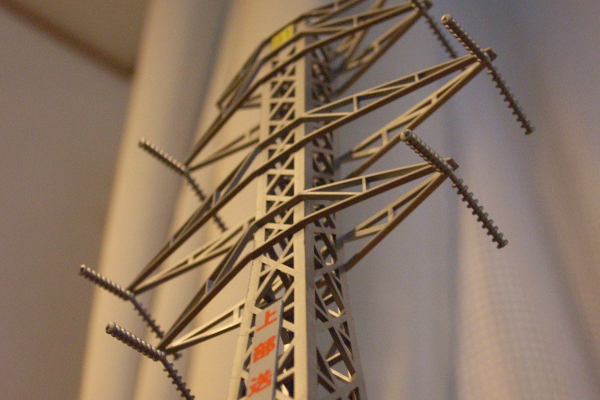 にしても、このプラモ。シンプルに見えて、難易度は激烈に高い。4枚の板を貼り合わせるだけなのだが、とっかかりがゼロなのだ。テープで仮組みして、楊枝で数度に分けて接着剤を流し込まなければならない。腕金は微妙に折り曲げて、先端を「点」で接着する仕様だし、碍子も、鉄塔の足も、凹凸がないところに、同じく「点」で接着する仕様。