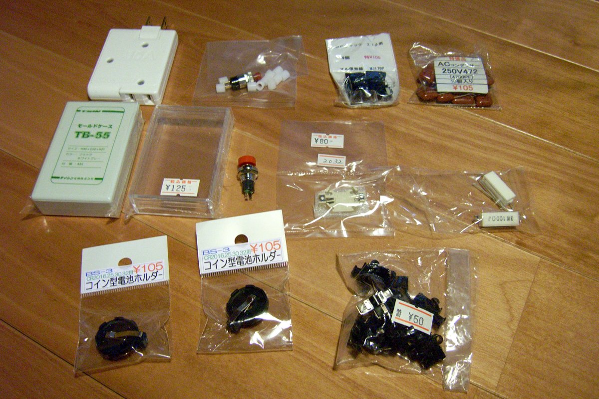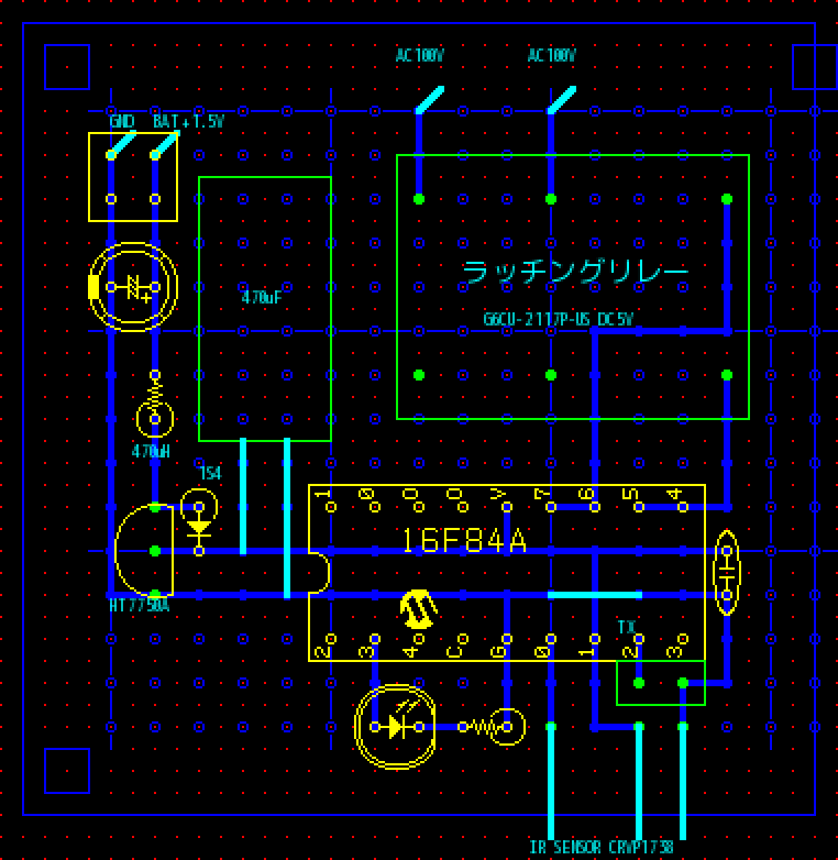 制御には「PIC16F648A」を、乾電池の1.5Vを5Vに昇圧するのに、PFMステップアップDC/DCコンバータ「HT7750A」を、リレーはラッチングタイプの「G6CU-2117P-US DC5V」を、赤外線センサには「CRVP1738」を用いた。