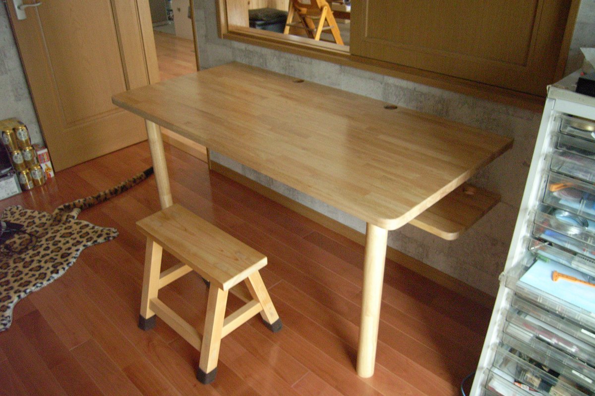 大きさは、幅140cm、奥行き70cm弱、高さ70cm。机の奥には2カ所の穴があり、電源等の配線が引き出せるようになっている。机の下には、棚板があり、そこにも3カ所の穴が空いている。アダプタ等を置くのに便利。
