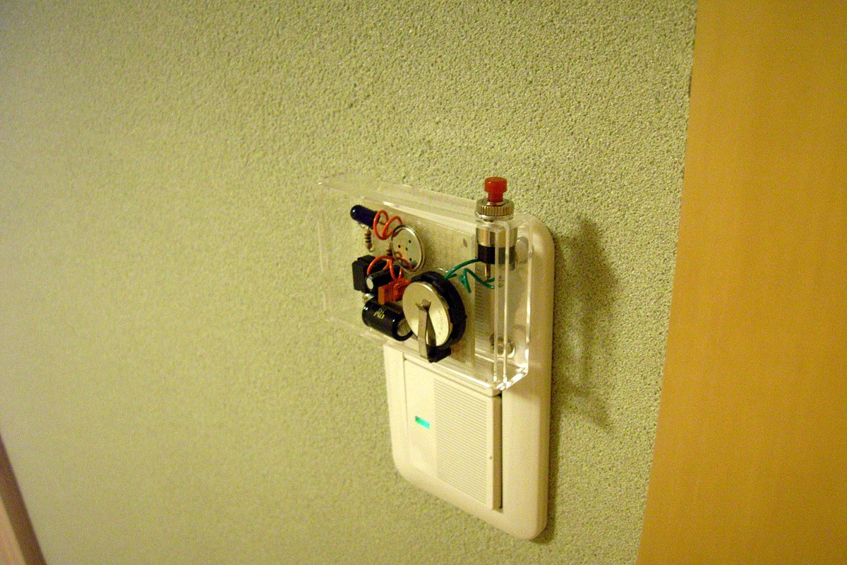 これで、壁のスイッチで照明をオン、オフにすることができるようになった。今まで、床に置いてある学習リモコンを、イチイチ腰をかがめて拾って操作していたのだが、特に暗い時はサッと見つけられずに困っていた。ちなみに、取り付けたケースは、少し上方にズラしてあるので、元のスイッチも操作できるようにしてある。