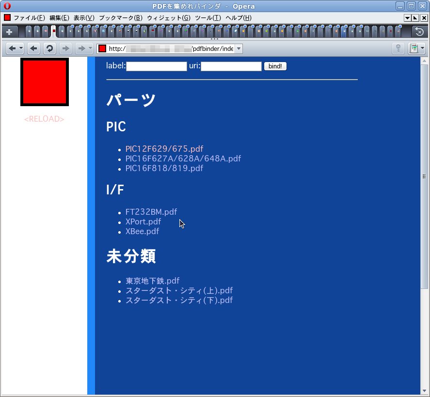 ちなみにオイラ、いわゆるブラウザのブックマークについては、自宅サーバ上に配した自作のスクリプトによって、全環境で共有化している。カテゴリ分け可能、かつ、アクセスすると勝手に上位に移動する仕組みで、鼻血が止まらないくらい便利な環境を構築済みなのである。じゃ、PDFについても、似たようなことをすればいいんじゃないか。どの環境からでもPDFを自宅のサーバ上に集められるようにし、かつ、閲覧できるようにすればいい。そうだ! 自宅サーバをバインダ代わりにして「PDFを集めれバインダ」!!