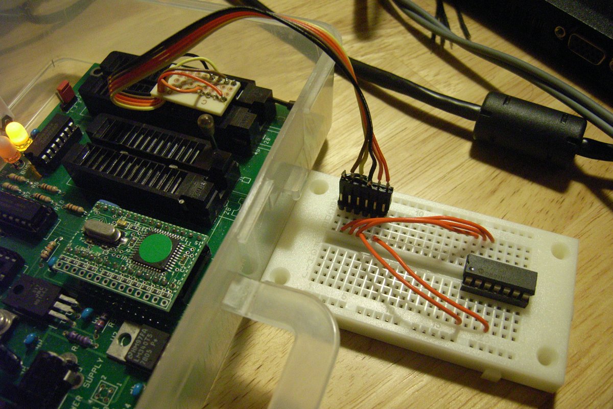 つーわけで、ずーっと前に作った、インサーキットプログラミング用のゲタを使い、信号をブレッドボードまで引っ張ってきて、ブレッドボード上で書き込む方法を考案した。実は、丸ピンICソケットのピンは、ブレッドボードへの抜き差しが容易かつ確実なので、作業効率は悪くないのである(製品による相性はあるだろうが)。