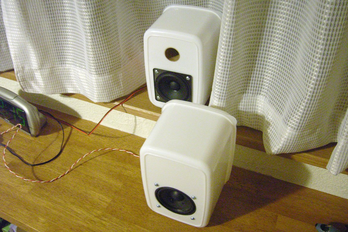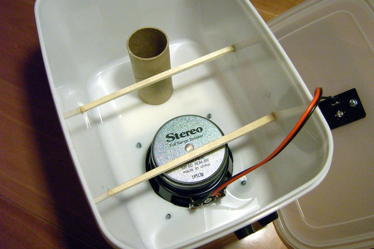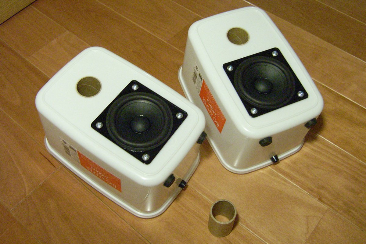先日、スピーカの容積を計測するために、100円のタッパーをふたつばかり追加購入したのだが、なんとなくやり始めたところ、やり始めたら止まらなくなってしまい、結局、こないだ秋月で購入した300円のスピーカの取り付けまでを済ませてしまった。タッパーとはいえ、キレイに丸い穴を空けるのはかなりタフな作業だったのだが……あぁ、疲れた……。